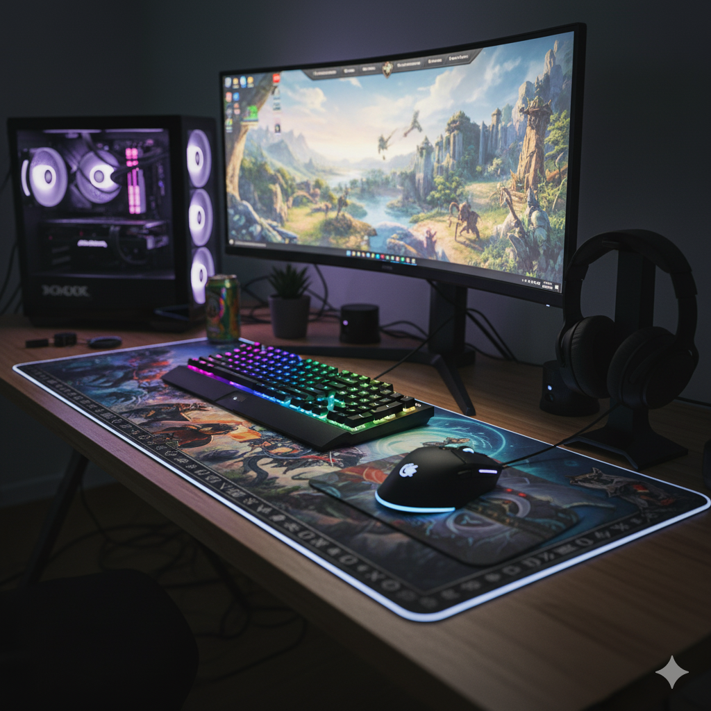 - Full-width gaming playmat (keyboard + mouse)
